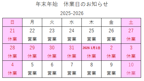 赤の日付は休業予定日です。